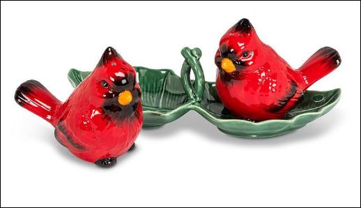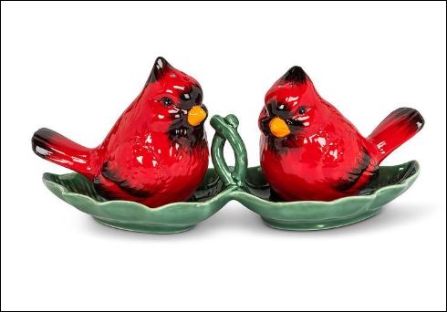 Elevate your tabletop with our Cardinal Salt and Pepper Shakers on a leaf tray. Crafted with charm, these shakers depict vibrant cardinals. Set upon a coordinating tray, the set stands at 8 inches wide, creating a delightful and functional display. The vivid red cardinals add a touch of nature to your dining experience, making it both practical and visually appealing. Spice up your meals with this beautifully crafted cardinal duo.