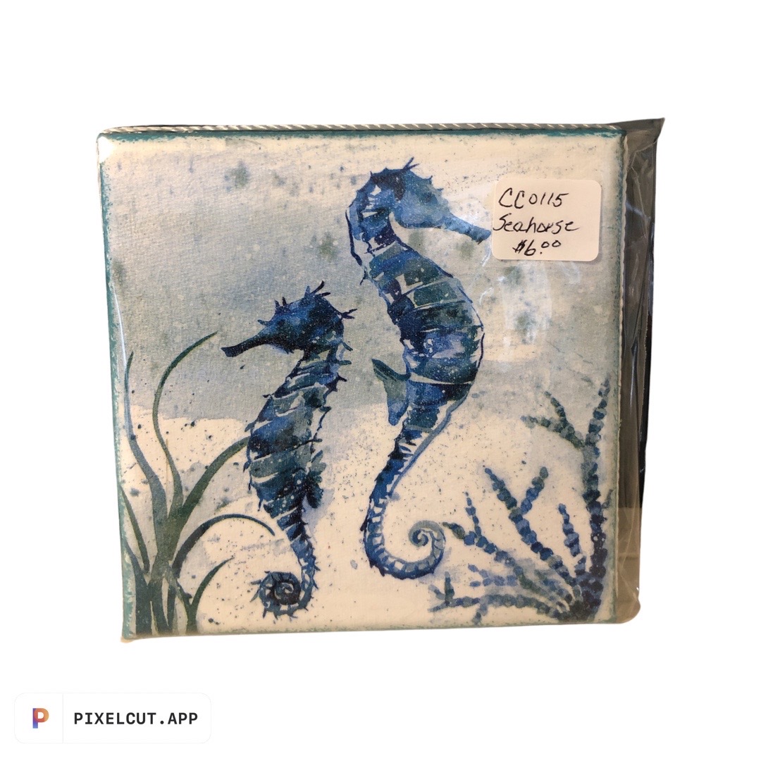 Decoupaged 5″ Seahorse pic on canvas handcrafted by Cottage Crafts