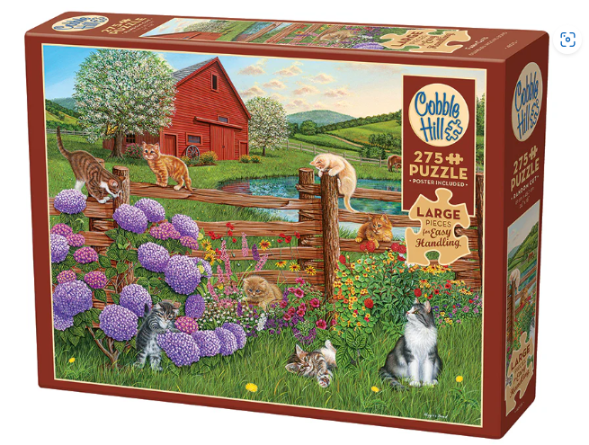 Farm Cats is an Easy Handling 275 piece puzzle featuring eight furry felines frolicking in the fresh flower field! An adorable farm scene for any puzzler or cat lover!