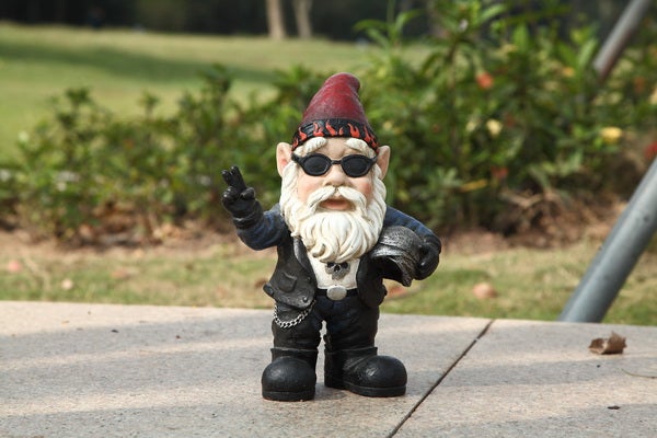 Add a little gnome fun to your entryway, garden or flowerbed. This Biker gnome is the complete package with the leather jacket, gloves, helmet, and sunglasses. A chain hangs from his belt and a skull adorns his t-shirt. The back of his jacket is detailed with “GARDEN OUTLAWS GNOMAD” and skull emblem design.. with a pointy gnome hat, imaginatively sculpted, this statue is made of polyresin and is good for both indoor and out.
