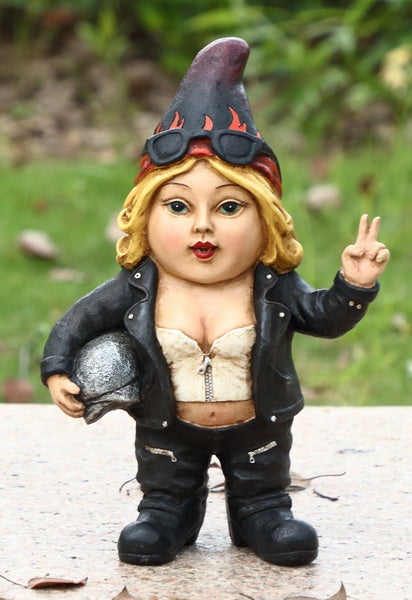 Add a little gnome fun to your entryway, garden or flowerbed. This Biker gnome is the complete package with the leather jacket, helmet, and sunglasses. The back of her jacket is detailed with “GNOMAD” and skull emblem design.. with a pointy gnome hat, imaginatively sculpted, this statue is made of polyresin and is good for both indoor and out. Her left hand is extending the Peace symbol to all who approach.