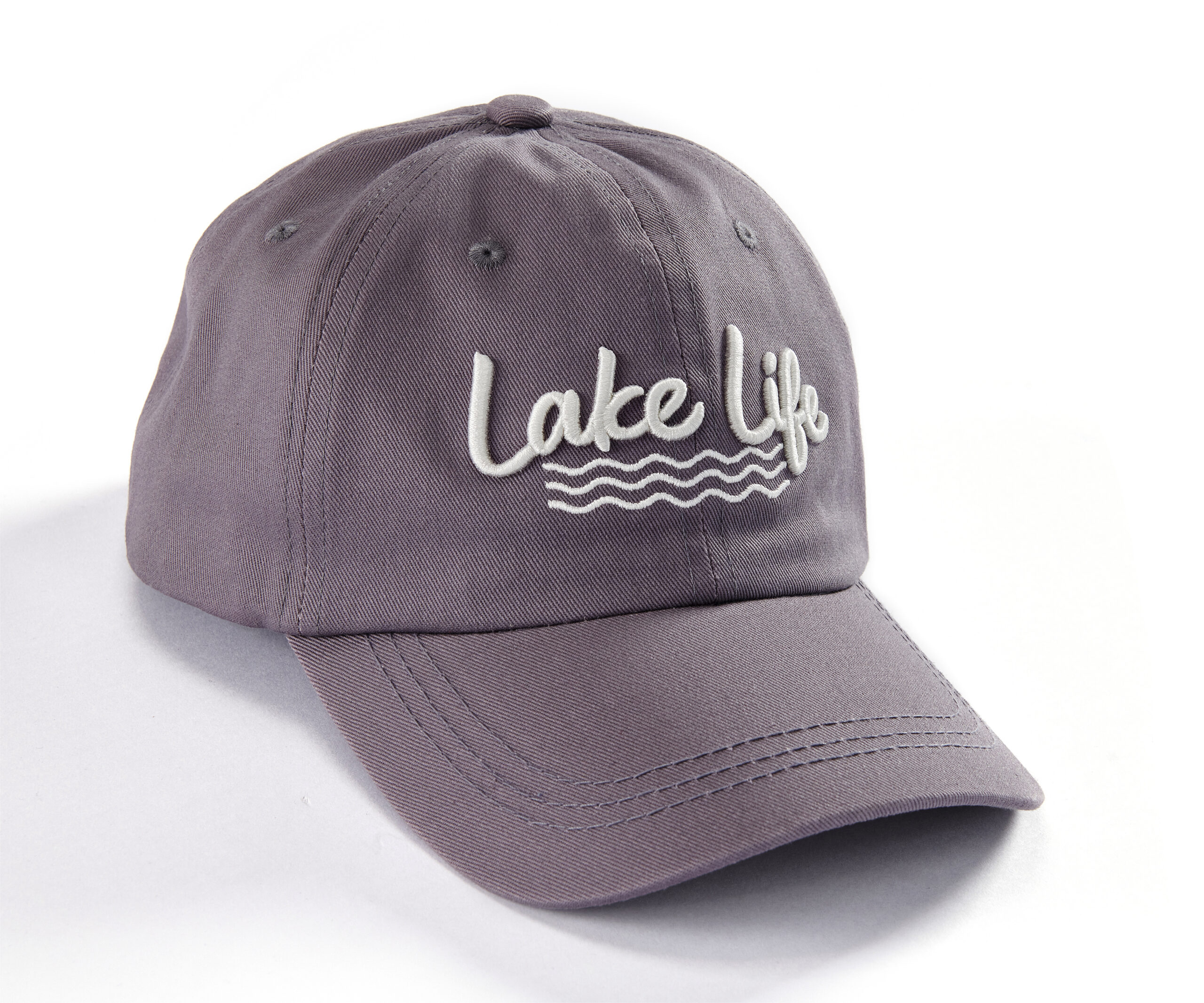 Raised embroidered graphics and applique with mid crown LAKE LIFE sentiment. Curved bill. Six panel construction with eyelets. Adjustable strap with slide buckle. Unstructured relaxed fit. One size fits most. Surface washable. 100% Cotton.
