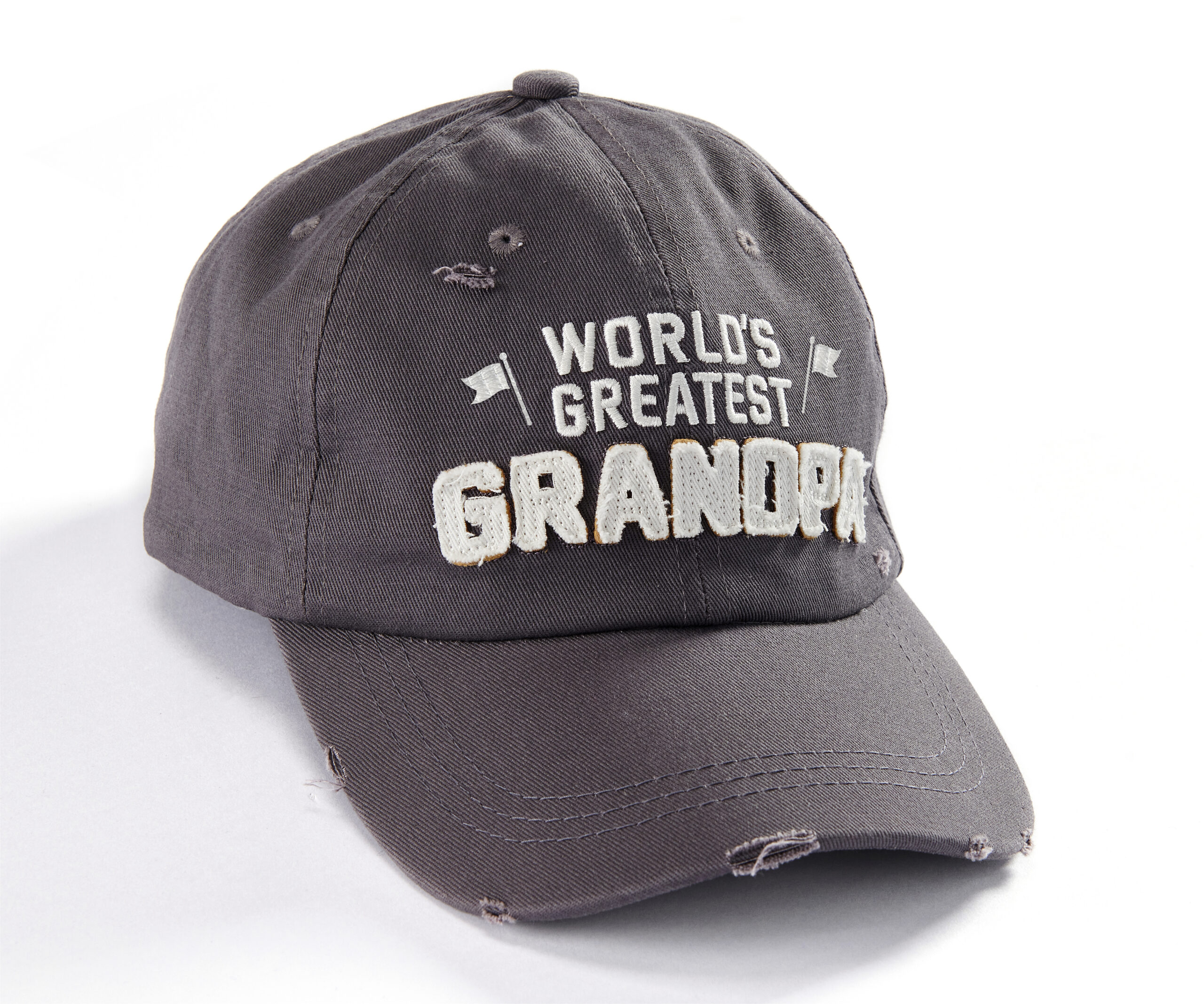 Raised embroidered graphics and applique with mid crown WORLD’S GREATEST GRANDPA sentiment. Curved bill. Six panel construction with eyelets. Adjustable strap with slide buckle. Unstructured relaxed fit. One size fits most. Surface washable. 100% Cotton.