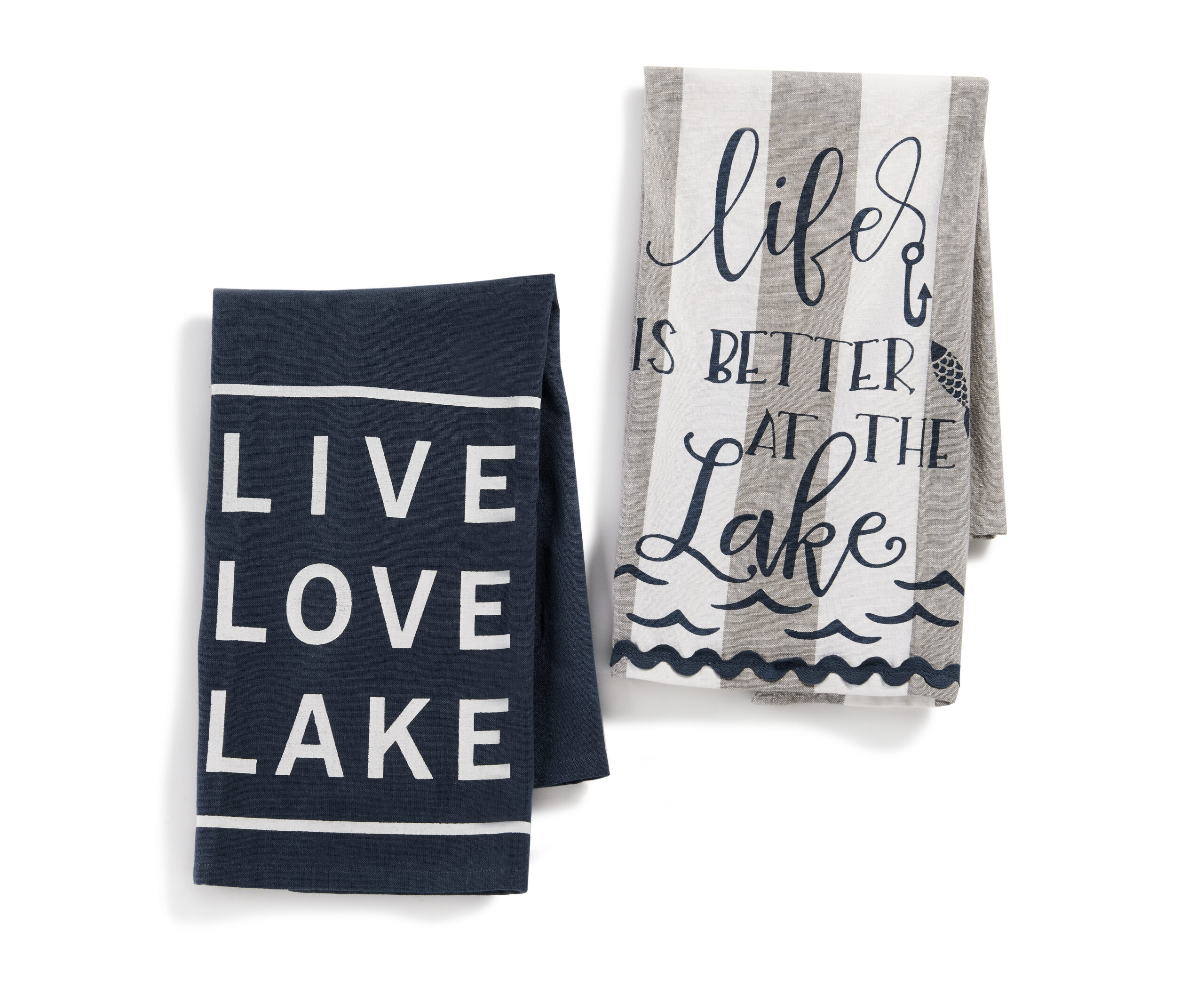 This nautically themed high quality cotton tea towel is complete with sentiments and crossed paddle graphics on striped and solid colored backgrounds. Available in 2 assorted sentiments:LIFE IS BETTER AT THE LAKE, LIVE LOVE LAKE. Machine Wash in Warm Water, Do Not Bleach, Tumble Dry, Iron on High Heat. Cotton.