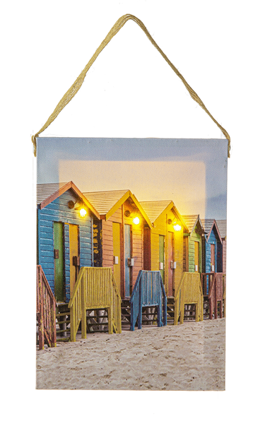Wood, printed canvas, LED light bulbs. Plastic stand and rope hanger give you the choice to stand or hang this picture.