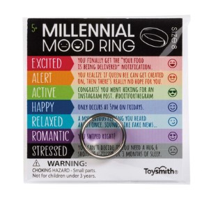 Monitor your mood but keep it fashion. Who has time to talk about their feelings? Most young people are too busy hustling their multiple jobs. The mood ring becomes a mood beacon. Fits most fingers.