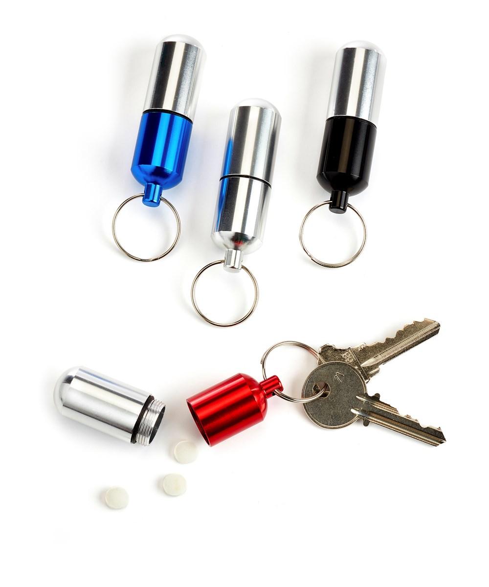 Extremely durable pill holder key chain featuring a water tight seal and key ring. Store and transport anything you can fit inside for your convenience. Available in 4 assorted colourways: Red, Black, Silver, Blue. Aluminum.