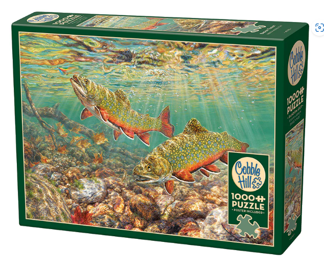 The beautiful Brook Trout swim so innocently. Will they fall for the bait? A beautiful 1000 piece fish puzzle full of fall colours to be enjoyed all year long.