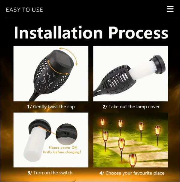 Home / Seasonal / Summer Seasonal / Solar powered torch lights Solar powered torch lights$6.99 6 in stock Solar powered torch lights quantity Add to cart SKU: ext4668 Categories: Garden, Seasonal, Summer Seasonal Tags: FLAME, flickering, garden, light, solar, torch