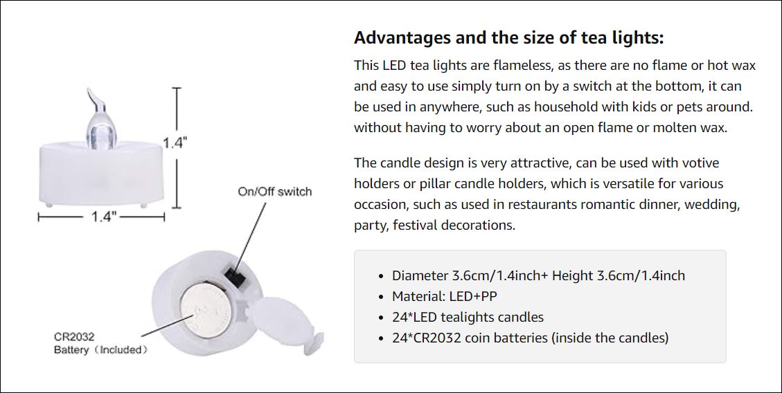 - Hight quality/save money–The material of these tea lights is plastic of superior quality.Each LED tea lights battery operated is thoroughly and rigorously tested.When you buy 24 pcs Battery Operated Tea Lights,you not only get the realistic tealight candles, but also get 24 CR2032 batteries.