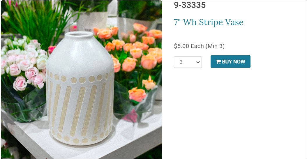 Home / Decor / Vases/jugs / 7″ white striped vase 7″ white striped vase$13.99 Weight: .3kg 1 in stock 7" white striped vase quantity Add to cart SKU: STG33335 Categories: Decor, Vases/jugs Additional information Additional information Weight .3 kg